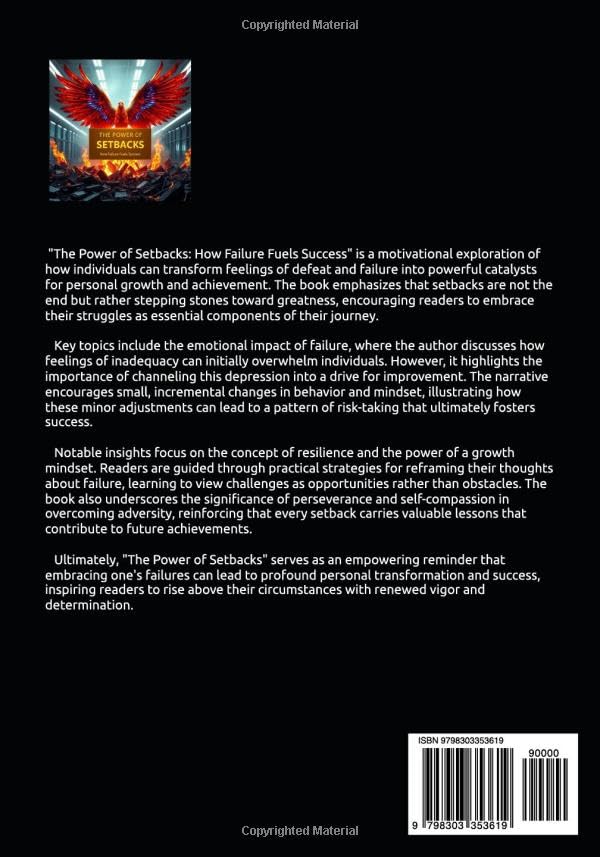 "The Power of Setbacks: How Failure Fuels Success" is a motivational exploration of how individuals can transform feelings of defeat and failure into powerful catalysts for personal growth and achievement. The book emphasizes that setbacks are not the end but rather stepping stones toward greatness, encouraging readers to embrace their struggles as essential components of their journey.