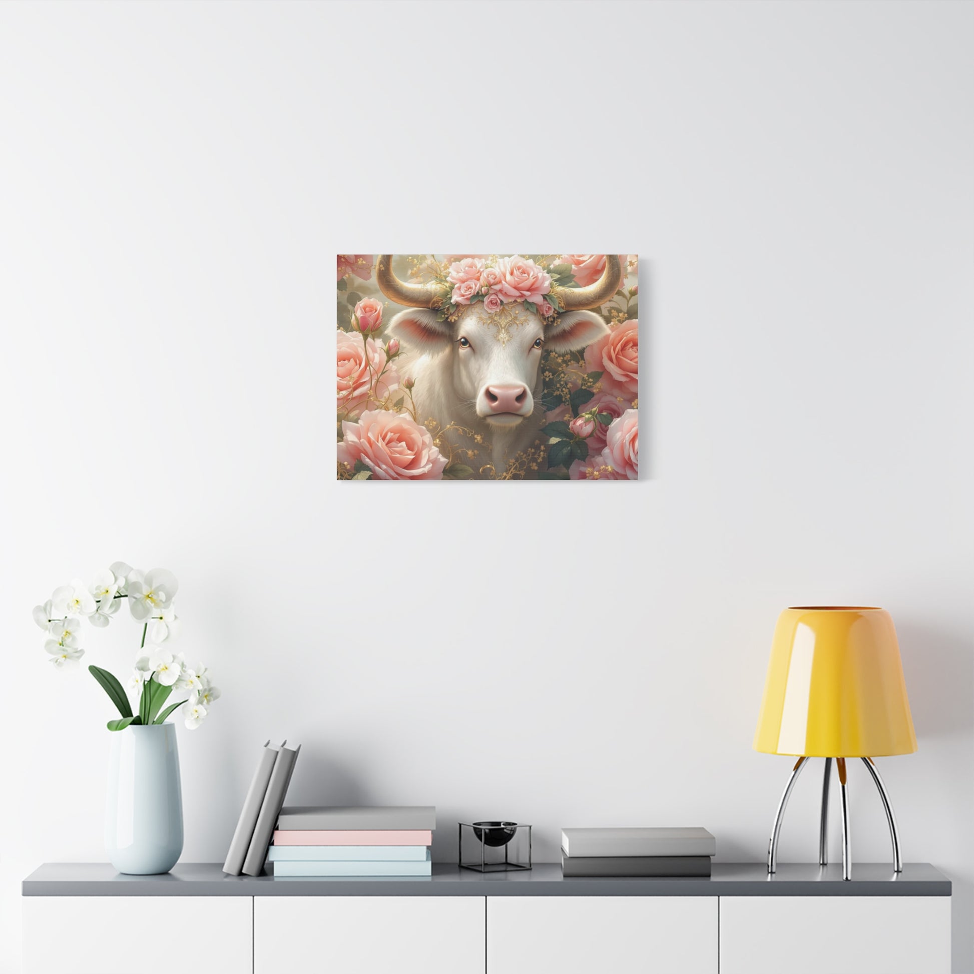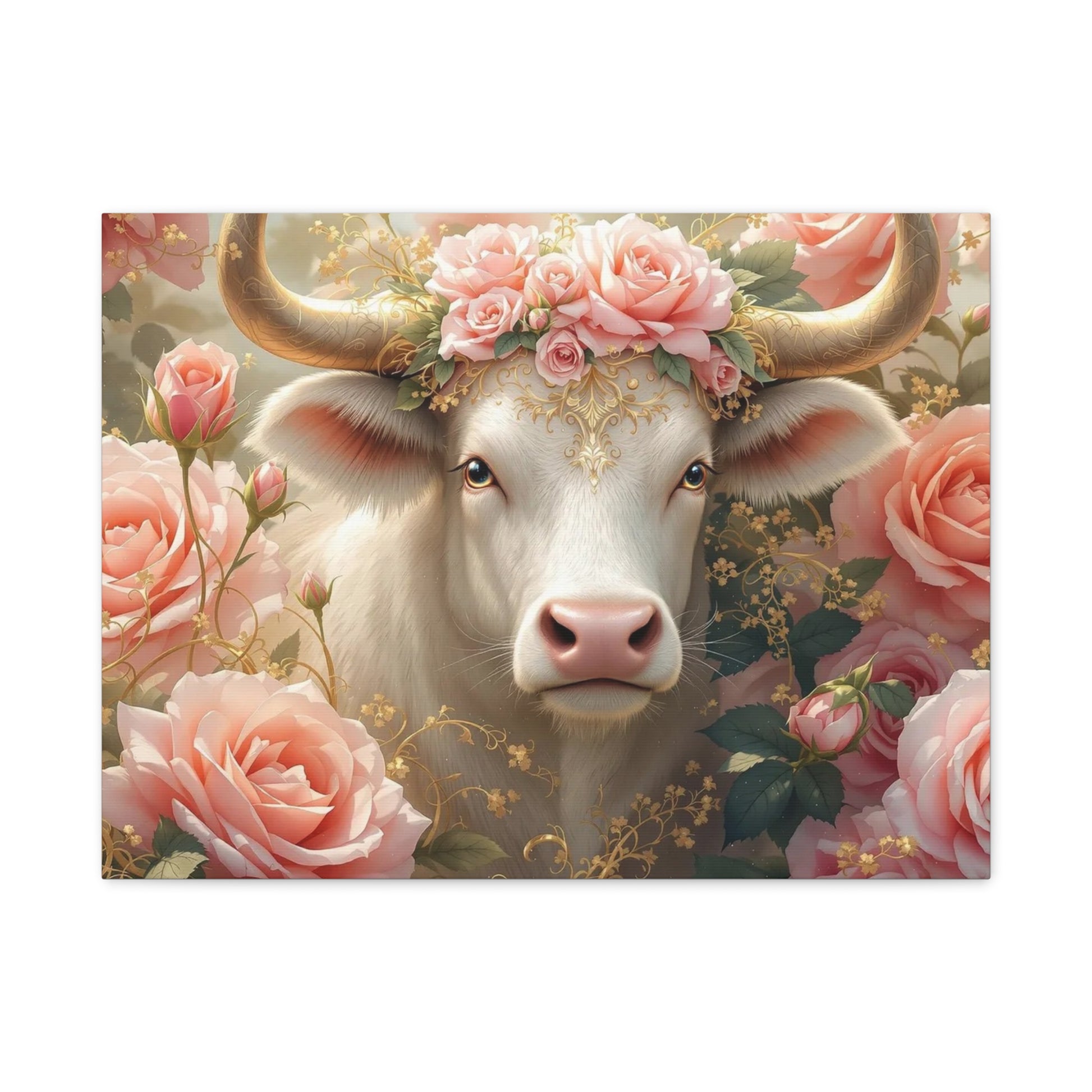A beautiful Pink Rose Cow Picture printed on a matte canvas, stretched and ready to hang. This canvas print gives off a whimsical and charming vibe, perfect for adding a touch of nature and uniqueness to any room. Ideal for animal lovers, nature enthusiasts, and anyone looking to bring a pop of color to their space. Perfect for gifting on birthdays, anniversaries, or as a housewarming present.