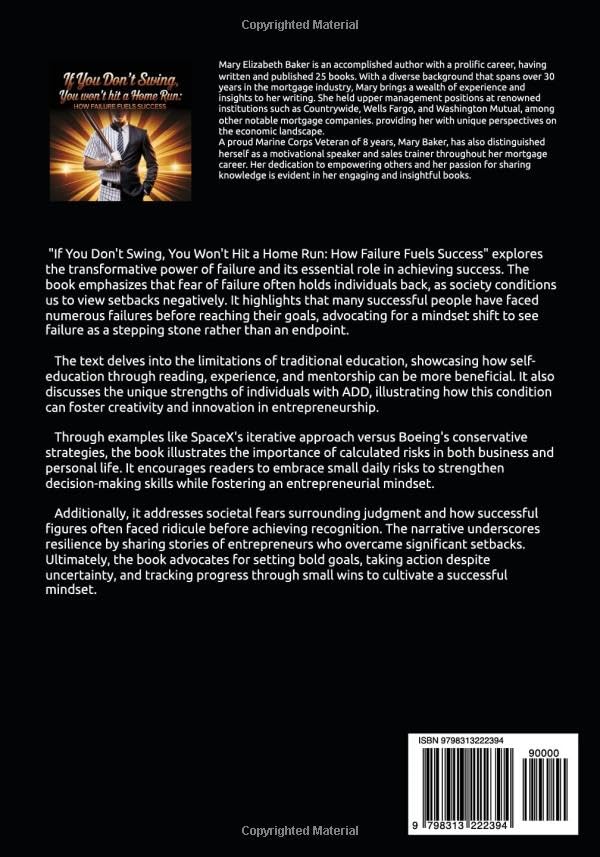 "If You Don't Swing, You Won't Hit a Home Run: How Failure Fuels Success" explores the transformative power of failure and its essential role in achieving success. The book emphasizes that fear of failure often holds individuals back, as society conditions us to view setbacks negatively. It highlights that many successful people have faced numerous failures before reaching their goals, advocating for a mindset shift to see failure as a stepping stone rather than an endpoint.